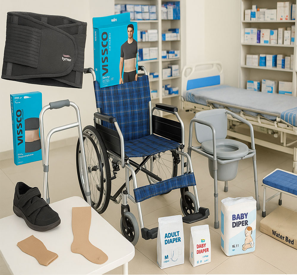 From orthopedic belts and braces to hospital beds, wheelchairs, diabetic footwear, and hygiene essentials, we ensure that our inventory meets the highest standards of safety and comfort. We proudly distribute products from renowned medical brands like BSN Medical Pvt. Ltd., MGRM, Tynor, Vissco, LP Support, and more.
