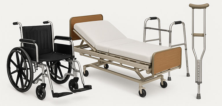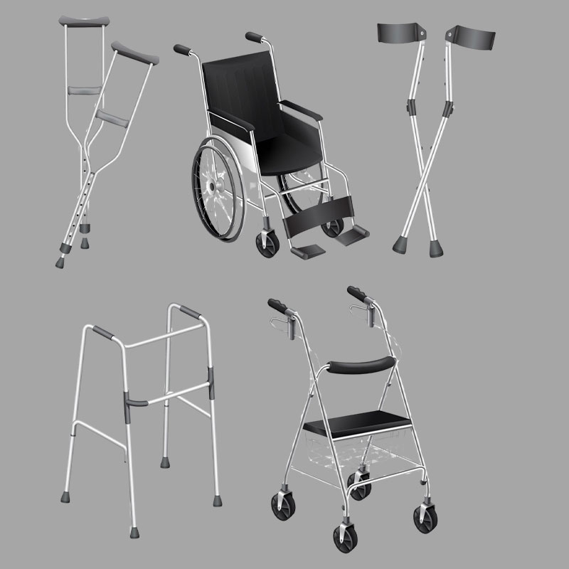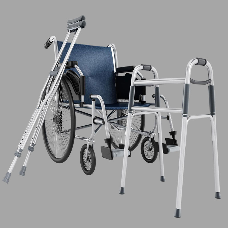 Wheelchairs, walkers, sticks, and comod chairs to support safe and easy movement.